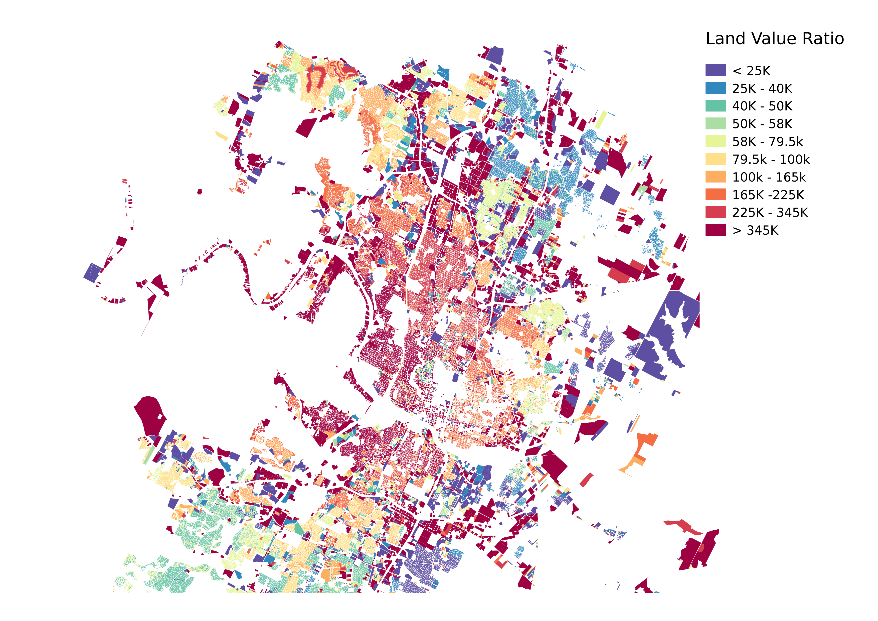 To demonstrate the usefulness of Land Value Ratio, I’ve created a few maps of Austin. The first is a map of land values per acre. Only residential-only properties are shown, leaving large gaps in downtown and the University of Texas, but around these focal points are the most valuable, dark red plots.