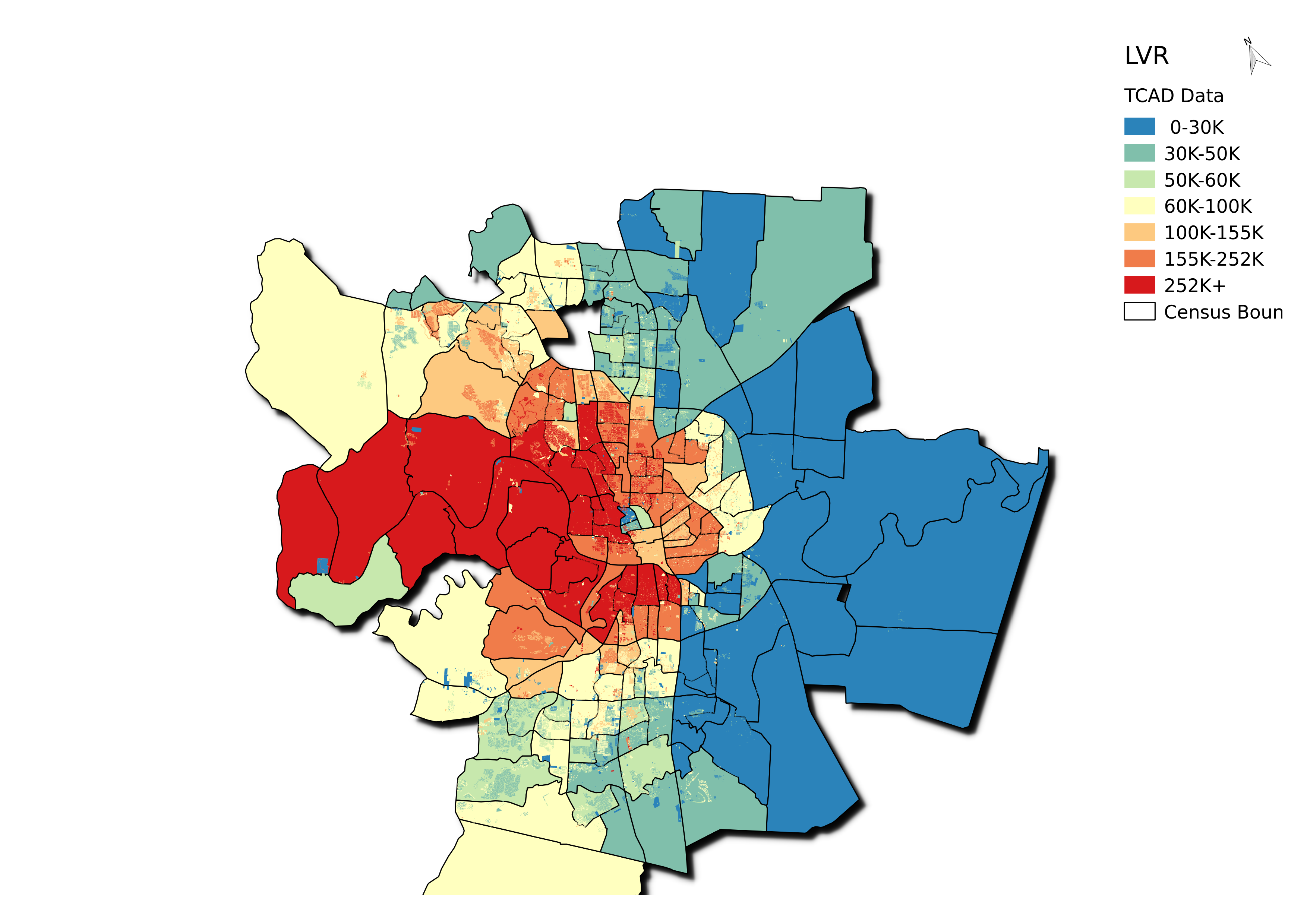 In this map, we have agglomerated census tracts into a single color. In this map, it becomes clear that West and Central Austin have high land values relative to their densities, with West Campus being a rare exception.